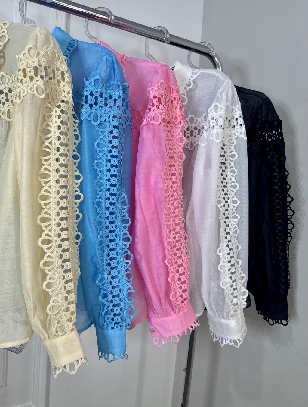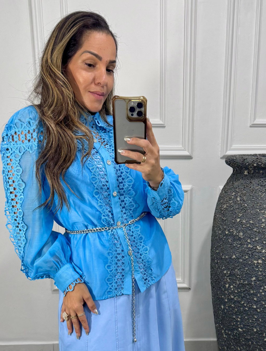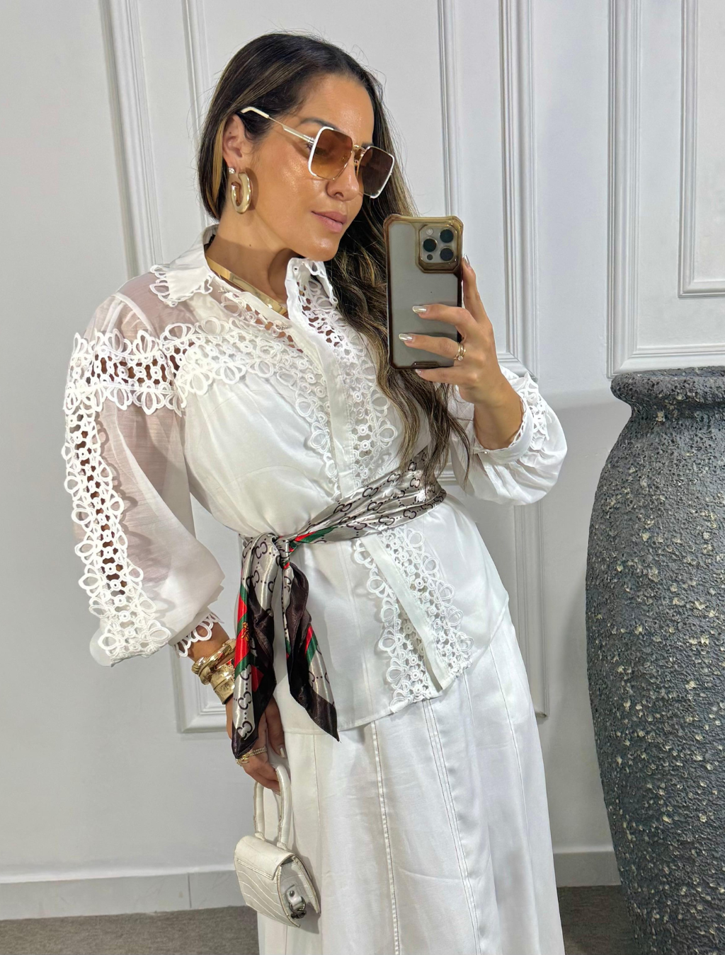 Camisa feminina em organza, com botões em strass que adicionam um toque de brilho e elegância. Detalhada com bordado em guipir, ela une delicadeza e sofisticação em cada detalhe. Uma peça refinada, perfeita para compor looks elegantes e modernos, do trabalho a eventos especiais.