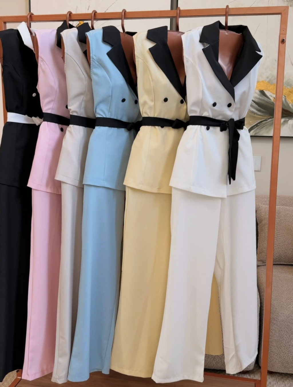 O colete bicolor é o grande destaque da peça, trazendo contraste sutil e harmonioso que valoriza a silhueta e eleva o visual com um toque contemporâneo. A modelagem de alfaiataria garante caimento perfeito, acabamento primoroso e conforto na medida certa.