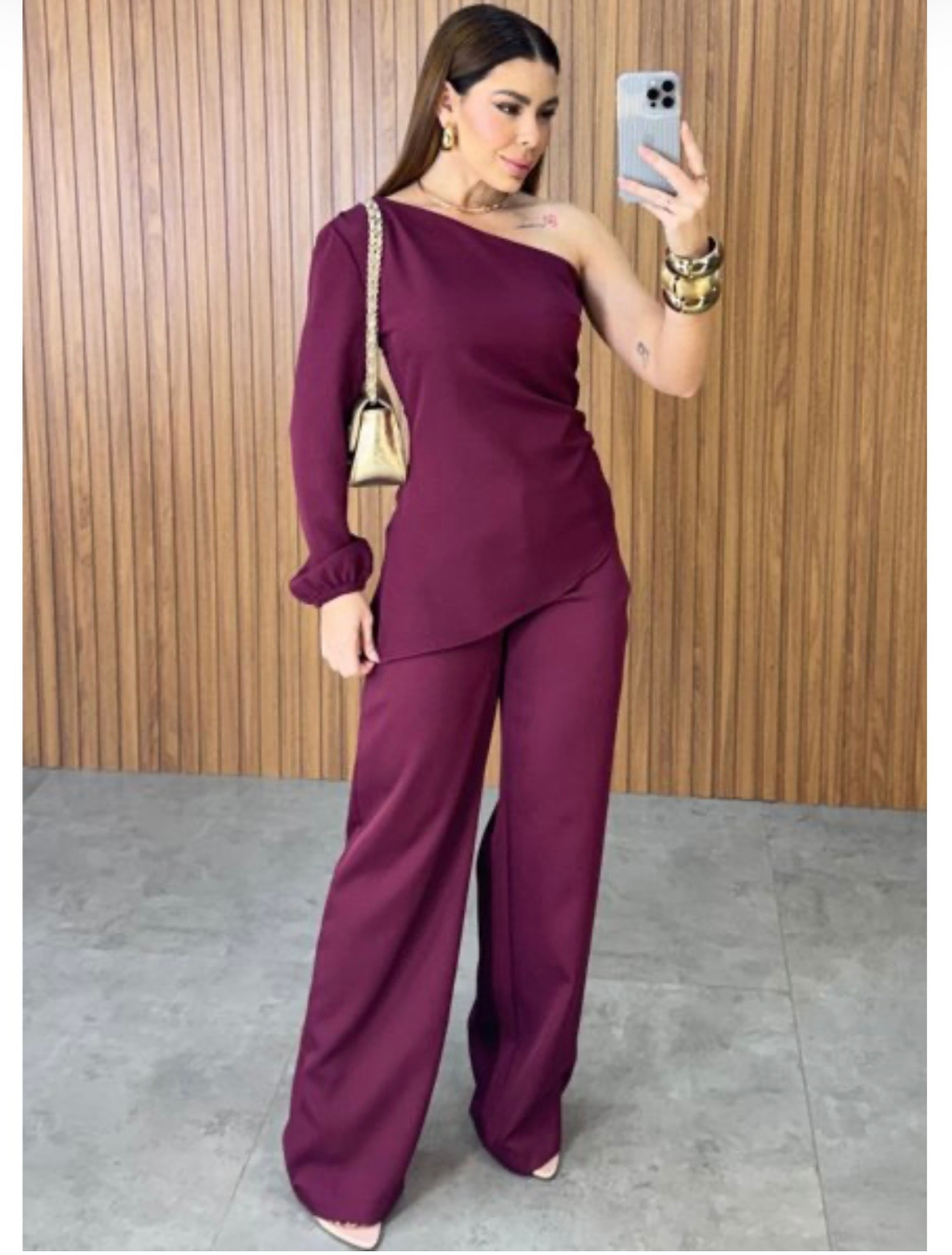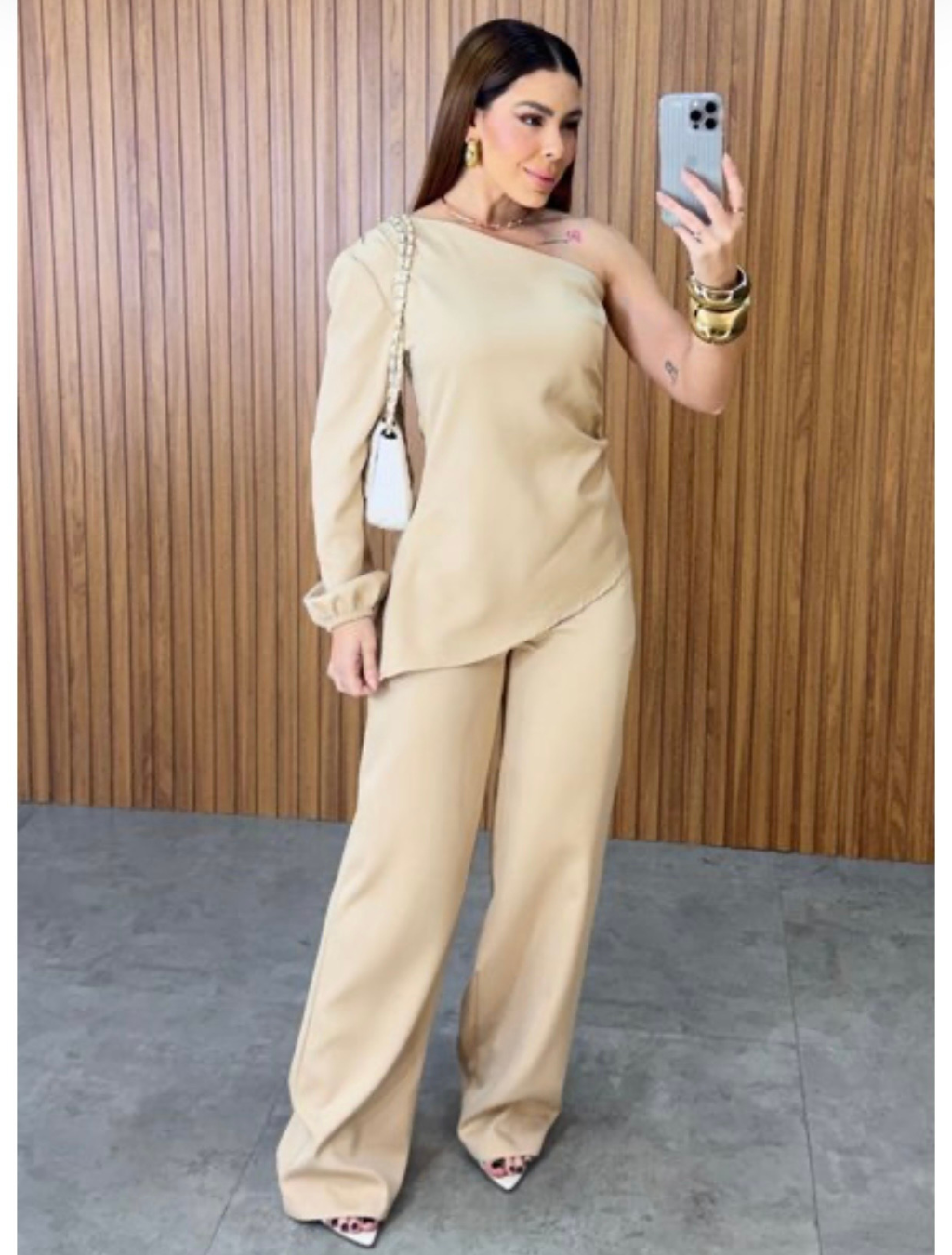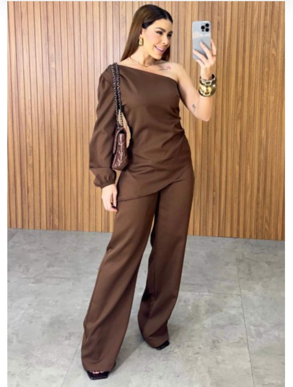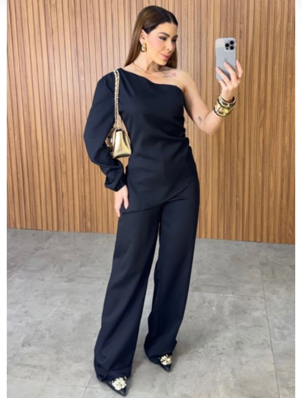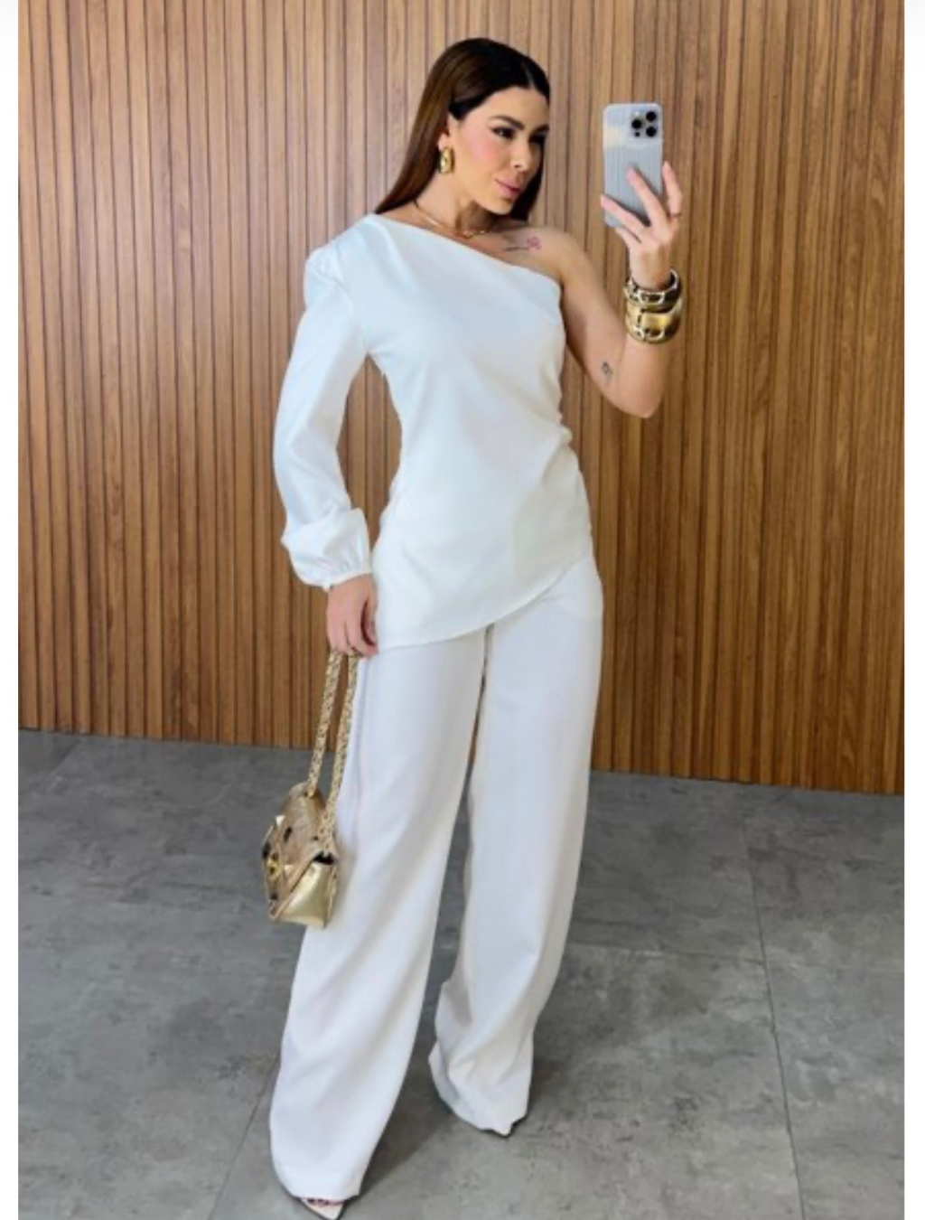 Elegância moderna em uma composição que transmite presença e sofisticação. O conjunto em alfaiataria traz blusa de um ombro só com manga longa, criando um visual elegante e marcante, enquanto a calça de modelagem reta e caimento impecável alonga a silhueta e garante um look refinado.
