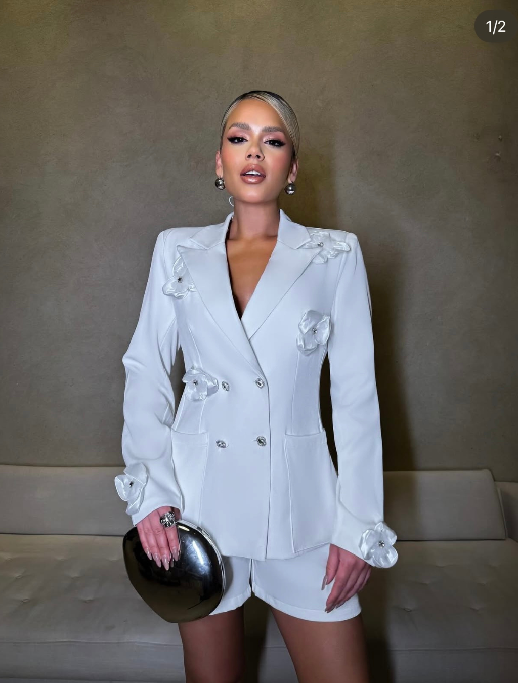 Composto por blazer com aplicações delicadas de flores em cetim e organza e botões com pedras e strass, que trazem um toque de sofisticação e feminilidade. O short em corte alfaiatado garante conforto e modernidade, resultando em um look chic e cheio de personalidade — perfeito para quem ama se vestir com estilo e elegância.