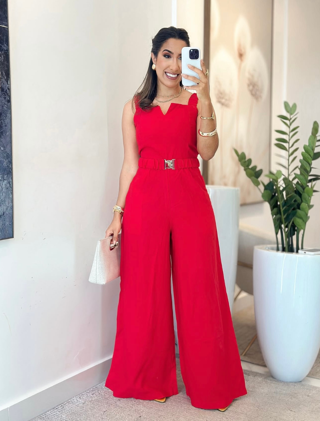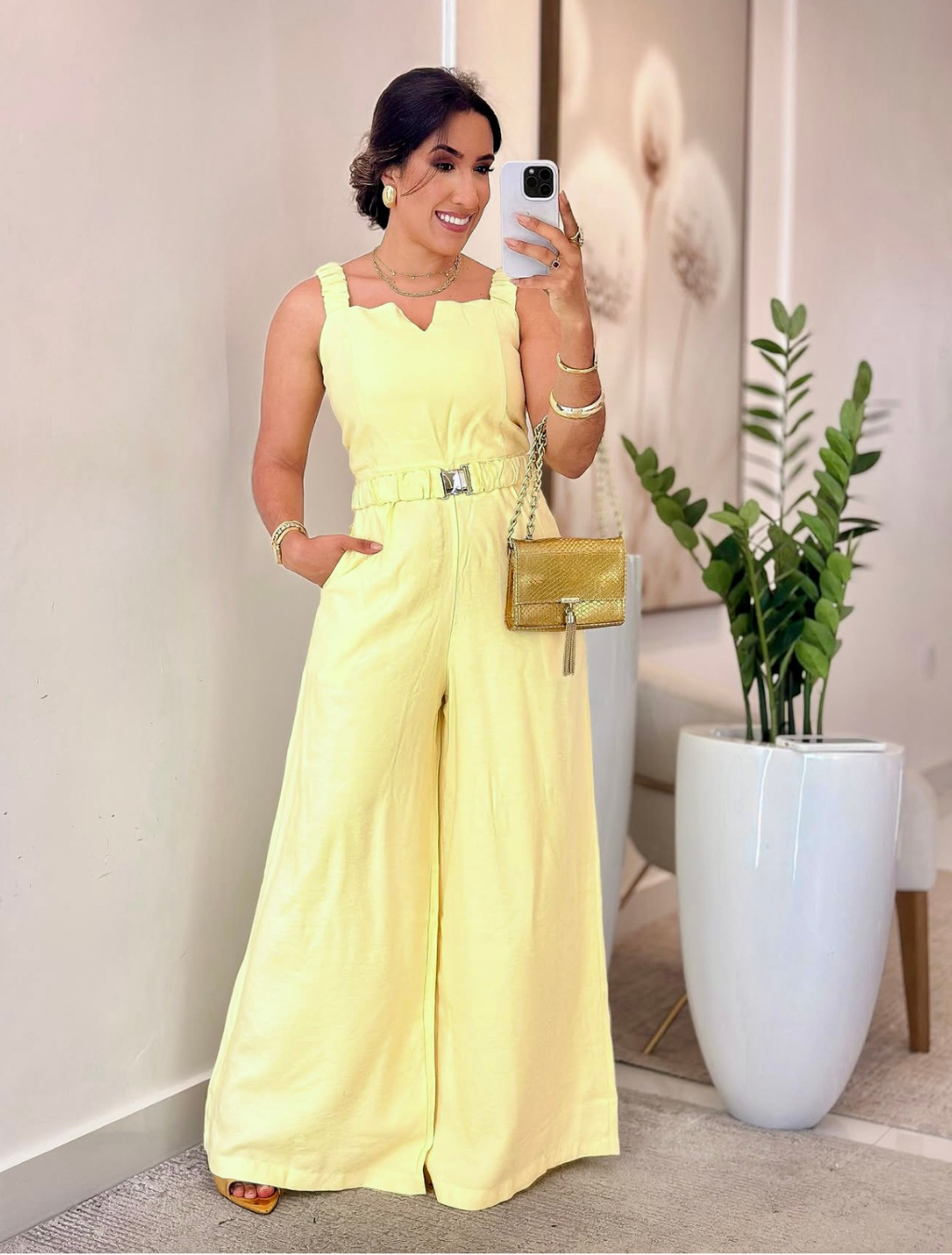 Com alças grossas que garantem sustentação e um caimento impecável, este macacão Max pantalona combina elegância e versatilidade em nível máximo. A modelagem ampla alonga a silhueta, enquanto o cinto no mesmo tecido permite ajustar a cintura e transformar completamente o visual.