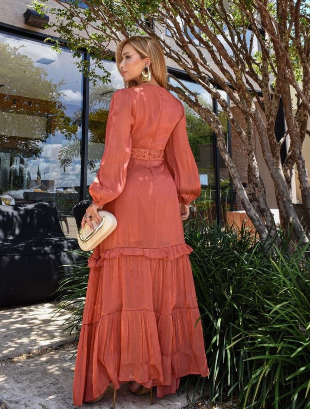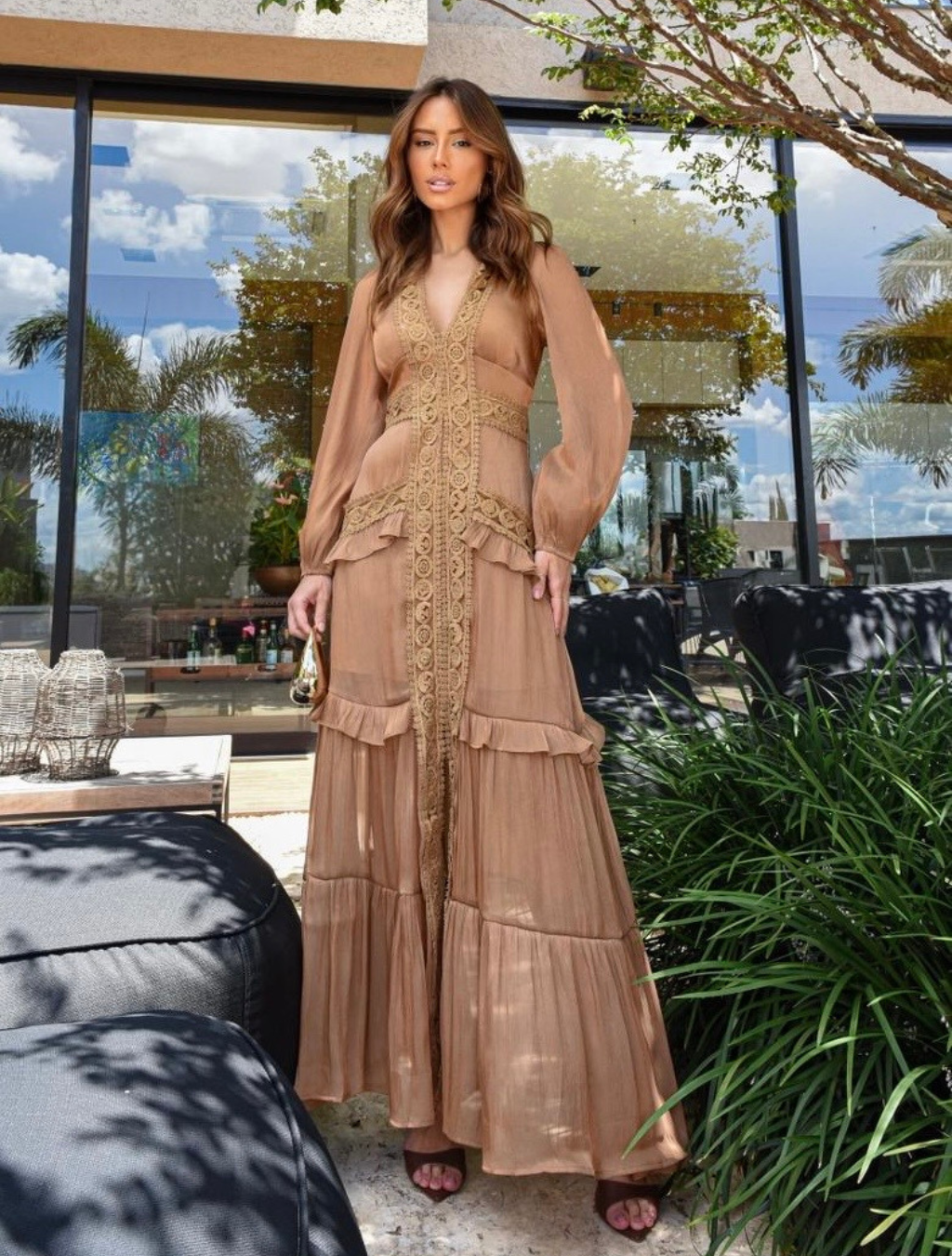 Um vestido que traduz feminilidade e sofisticação em cada detalhe. Confeccionado em tecido leve e fluido, possui modelagem longa que valoriza a silhueta e garante movimento elegante ao caminhar.