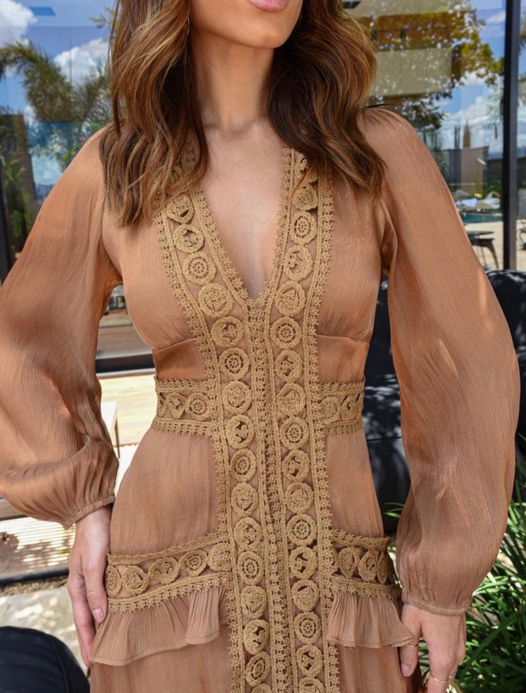 O destaque fica por conta dos detalhes em renda delicada ao longo da peça, que trazem charme e um toque romântico ao look. O decote em V alonga a silhueta e as mangas longas com leve volume completam a composição com elegância e delicadeza.