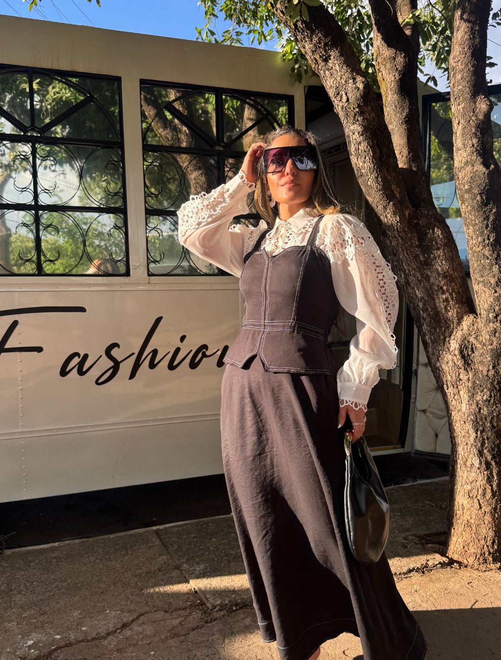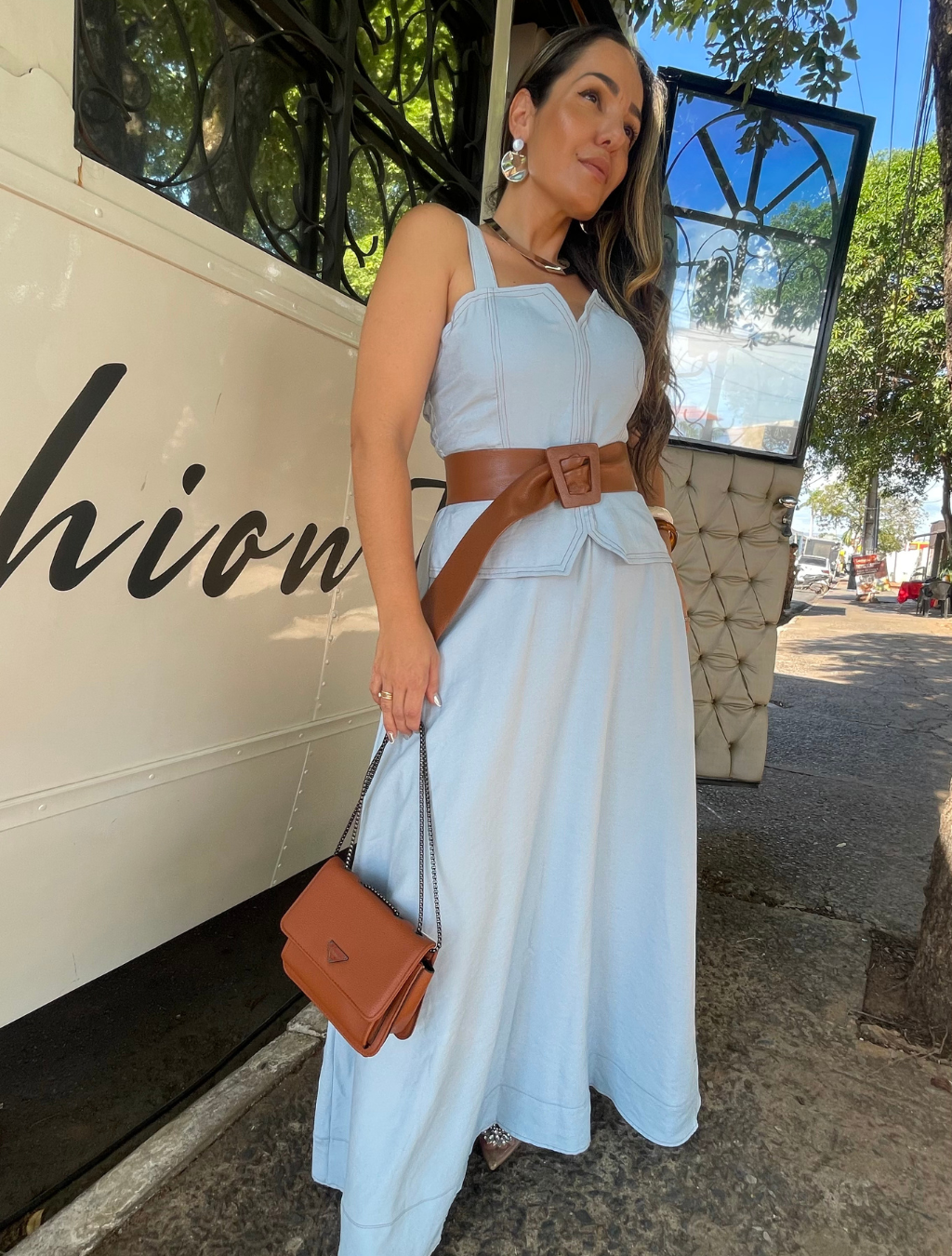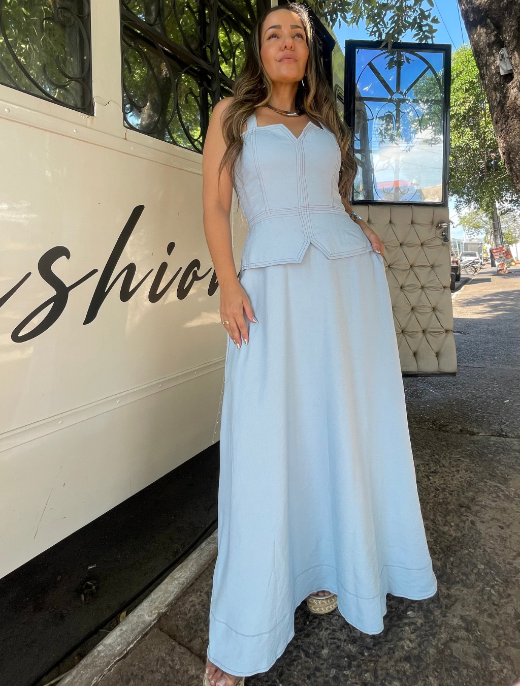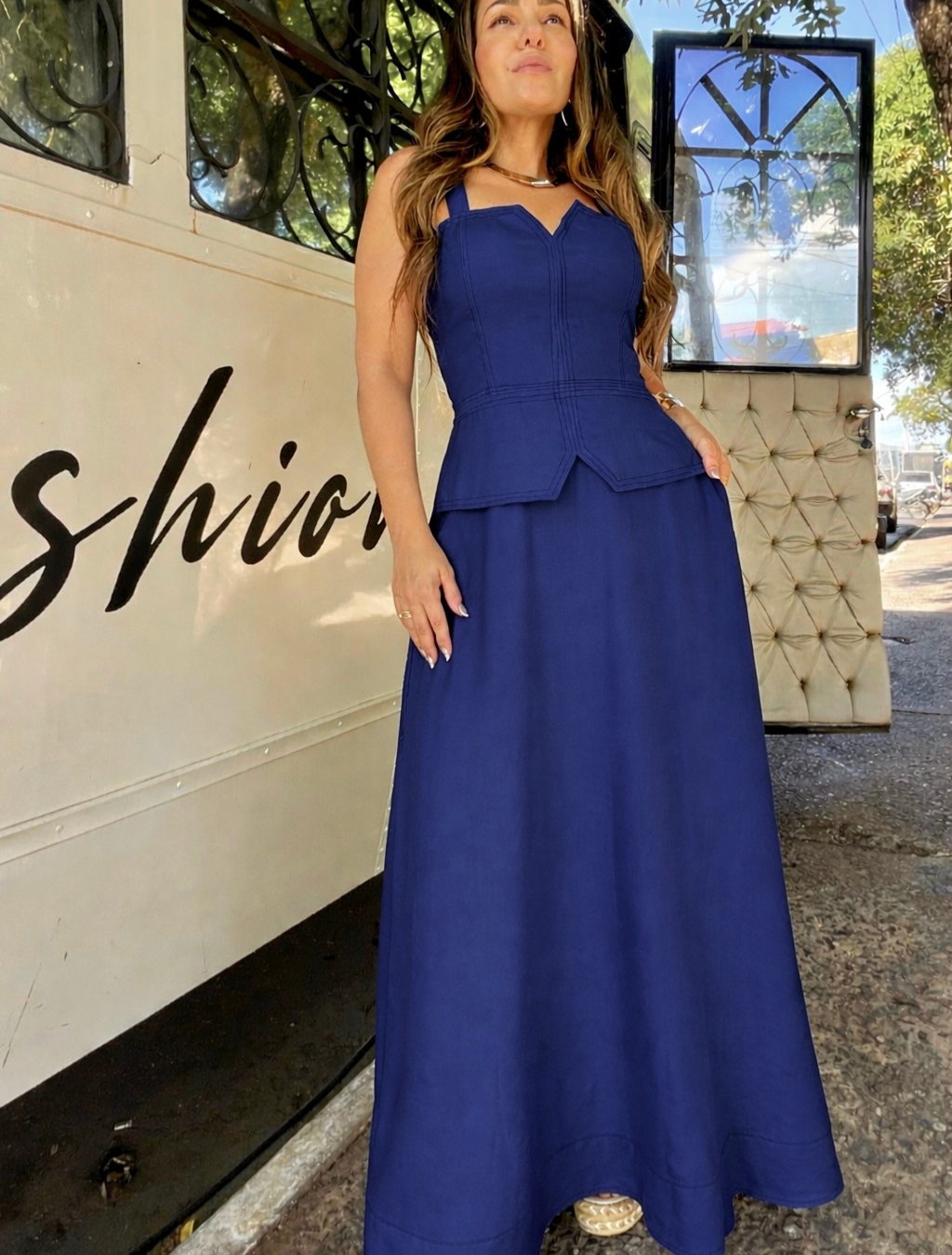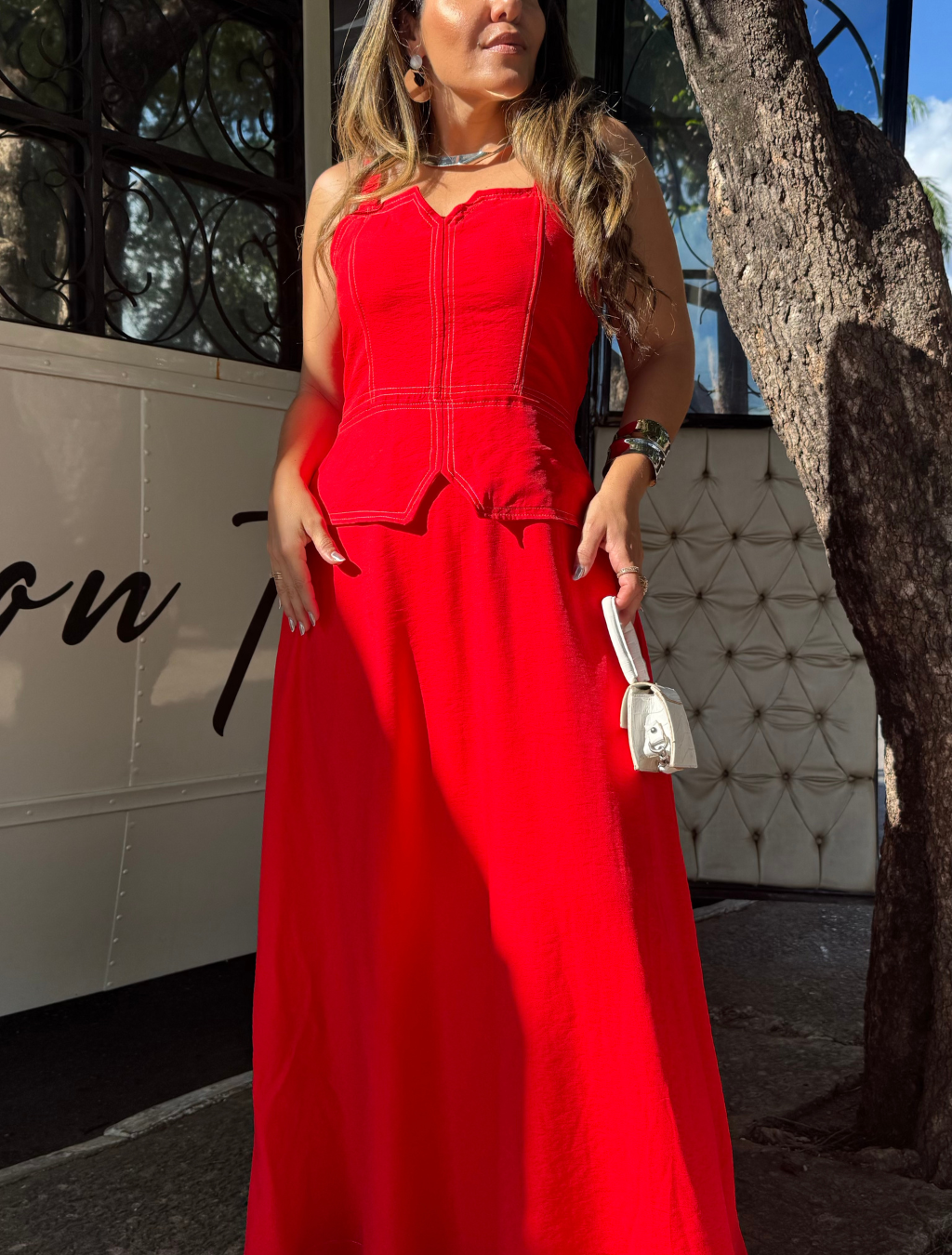 Vestido godê com costura pespontada — elegância que valoriza sua silhueta.