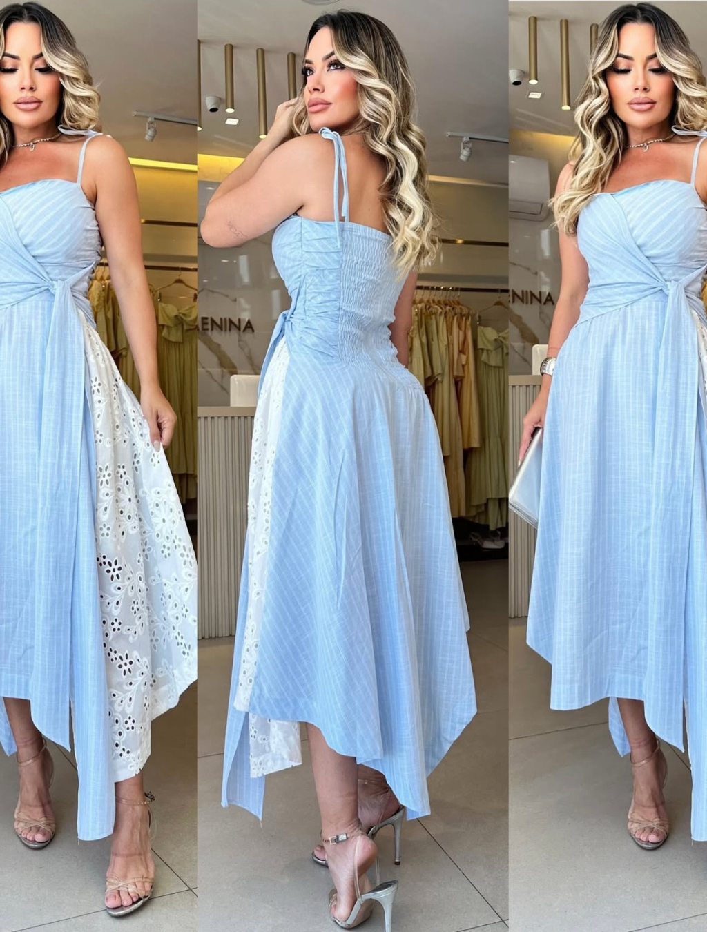 Um vestido que une sofisticação e modernidade em cada detalhe. Com modelagem godê impecável, ele valoriza a silhueta com leveza e movimento. A estampa risca de giz traz um toque clássico e atemporal, enquanto os delicados detalhes em lese acrescentam charme, exclusividade e feminilidade à peça.